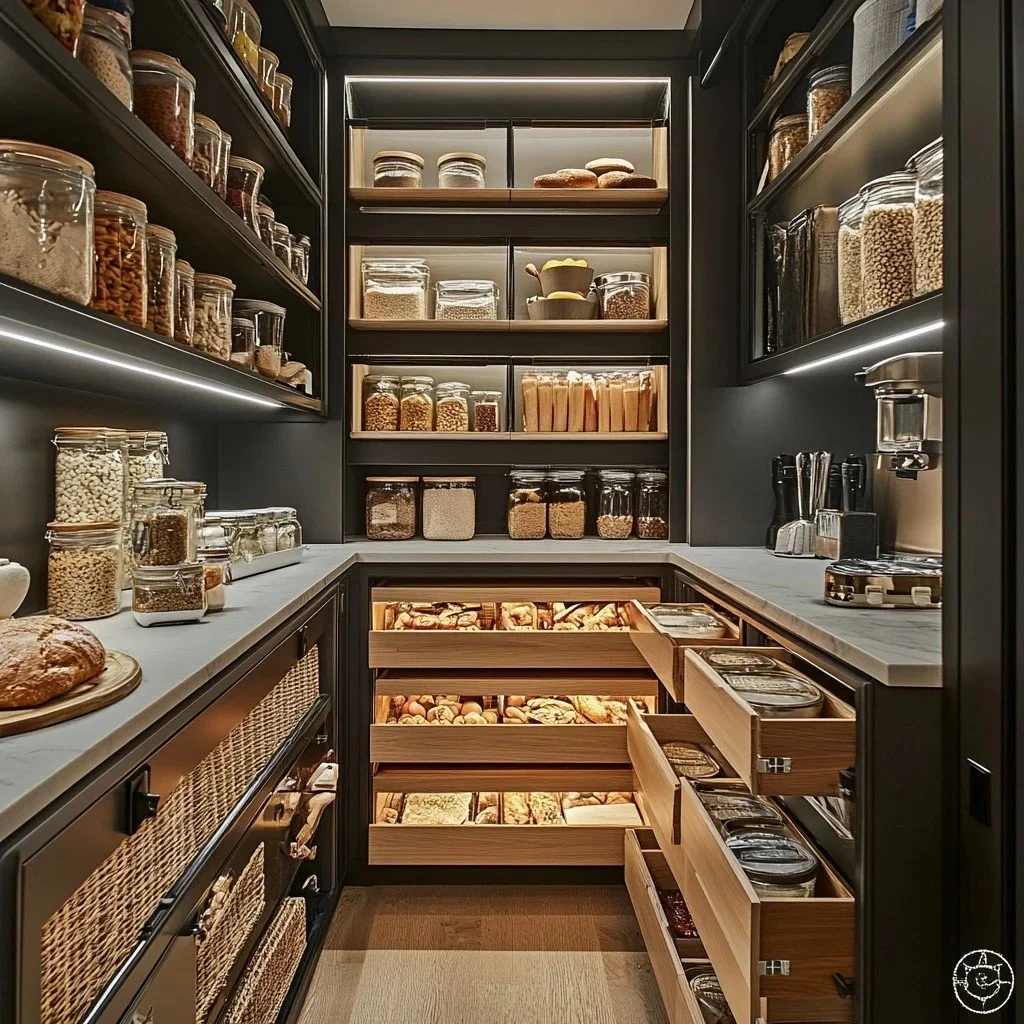 Walk-in pantries with custom shelving, designed to suit your needs..