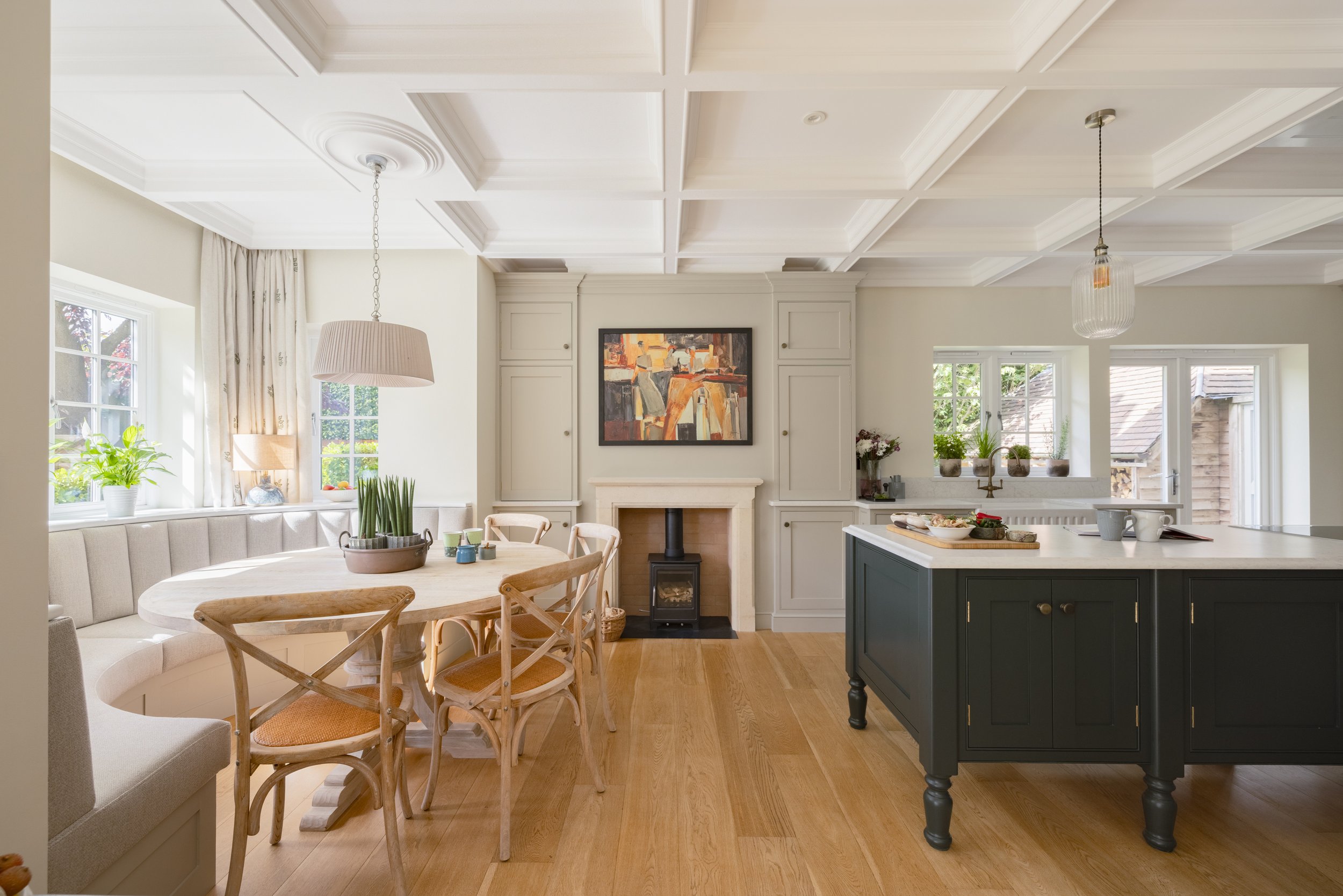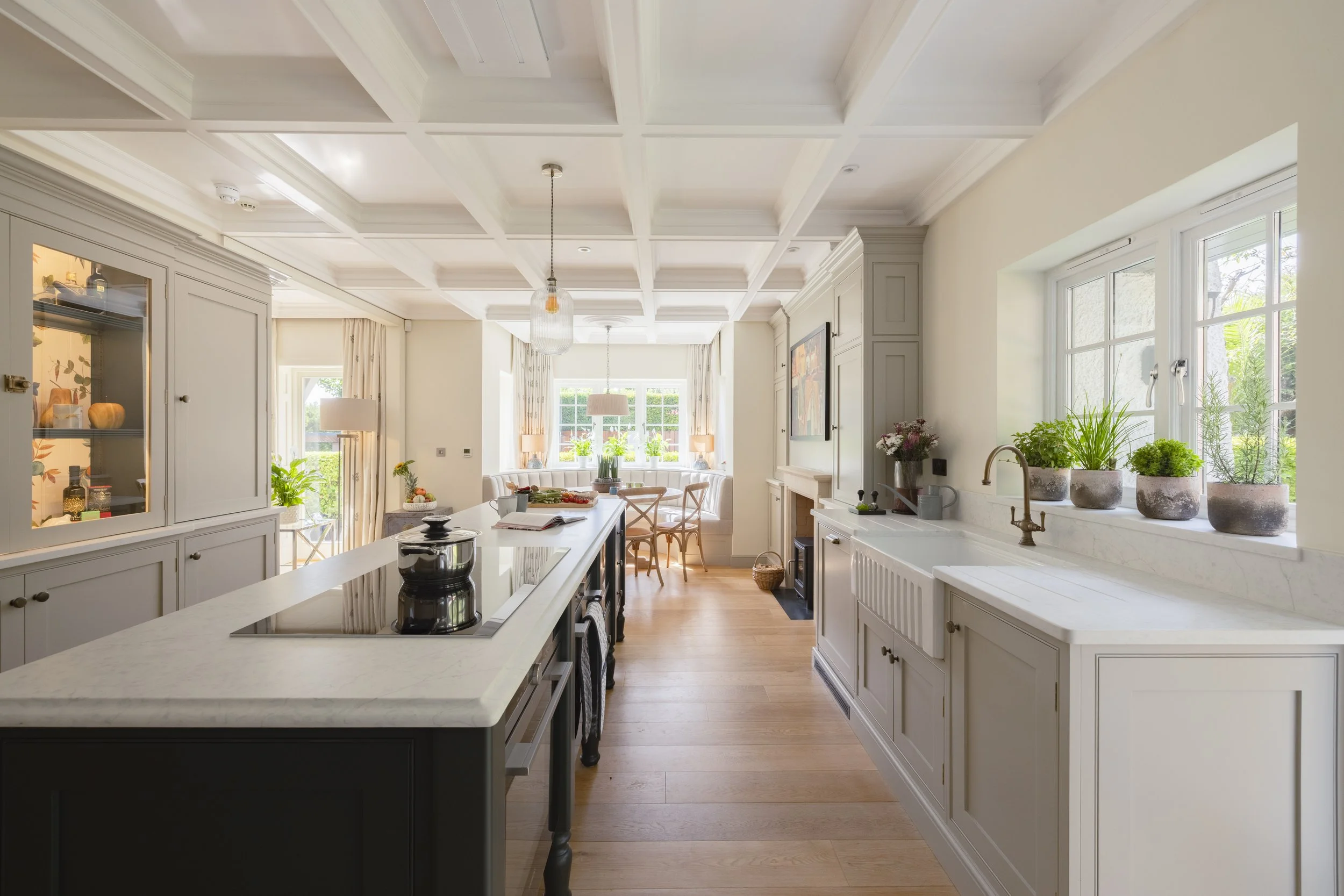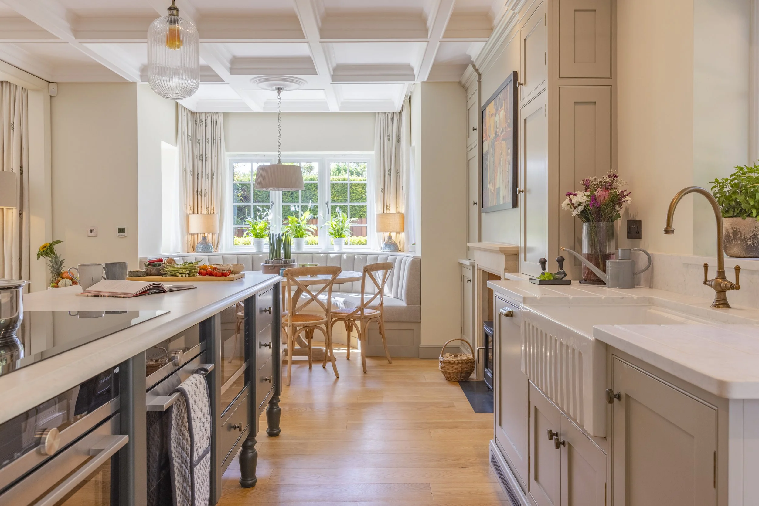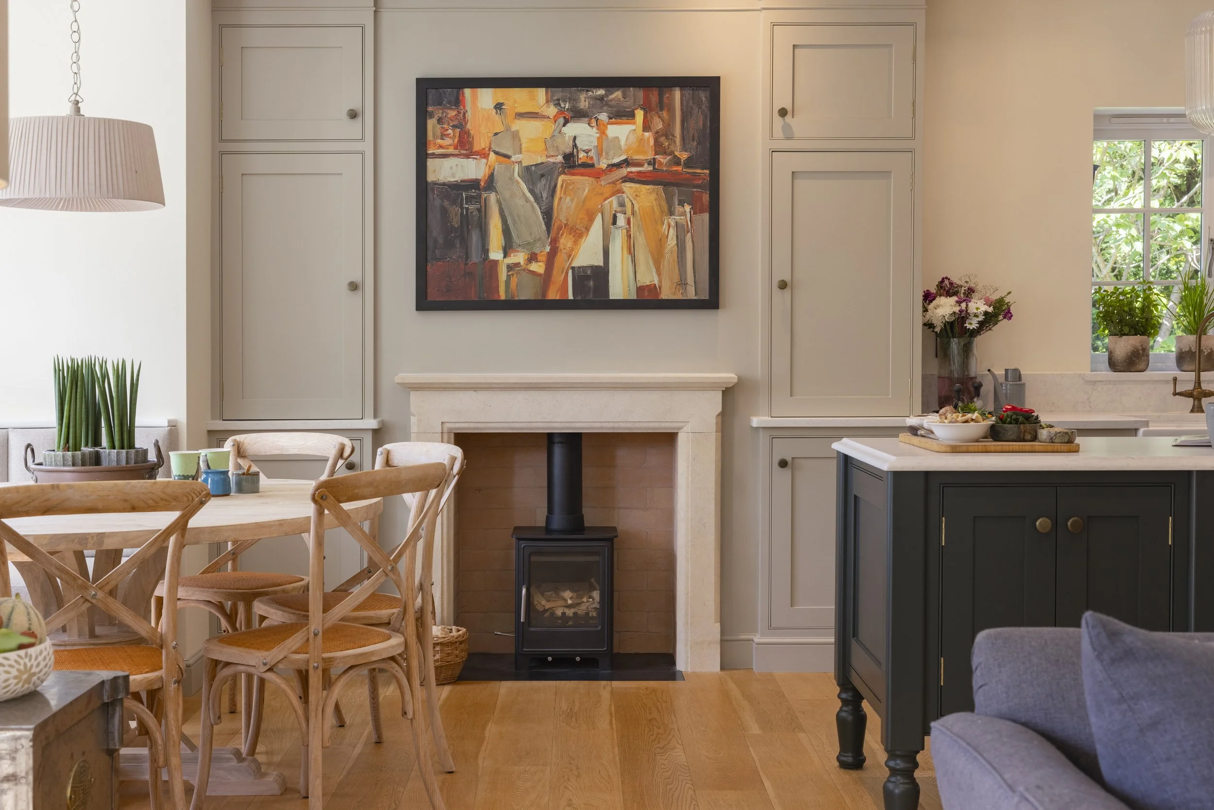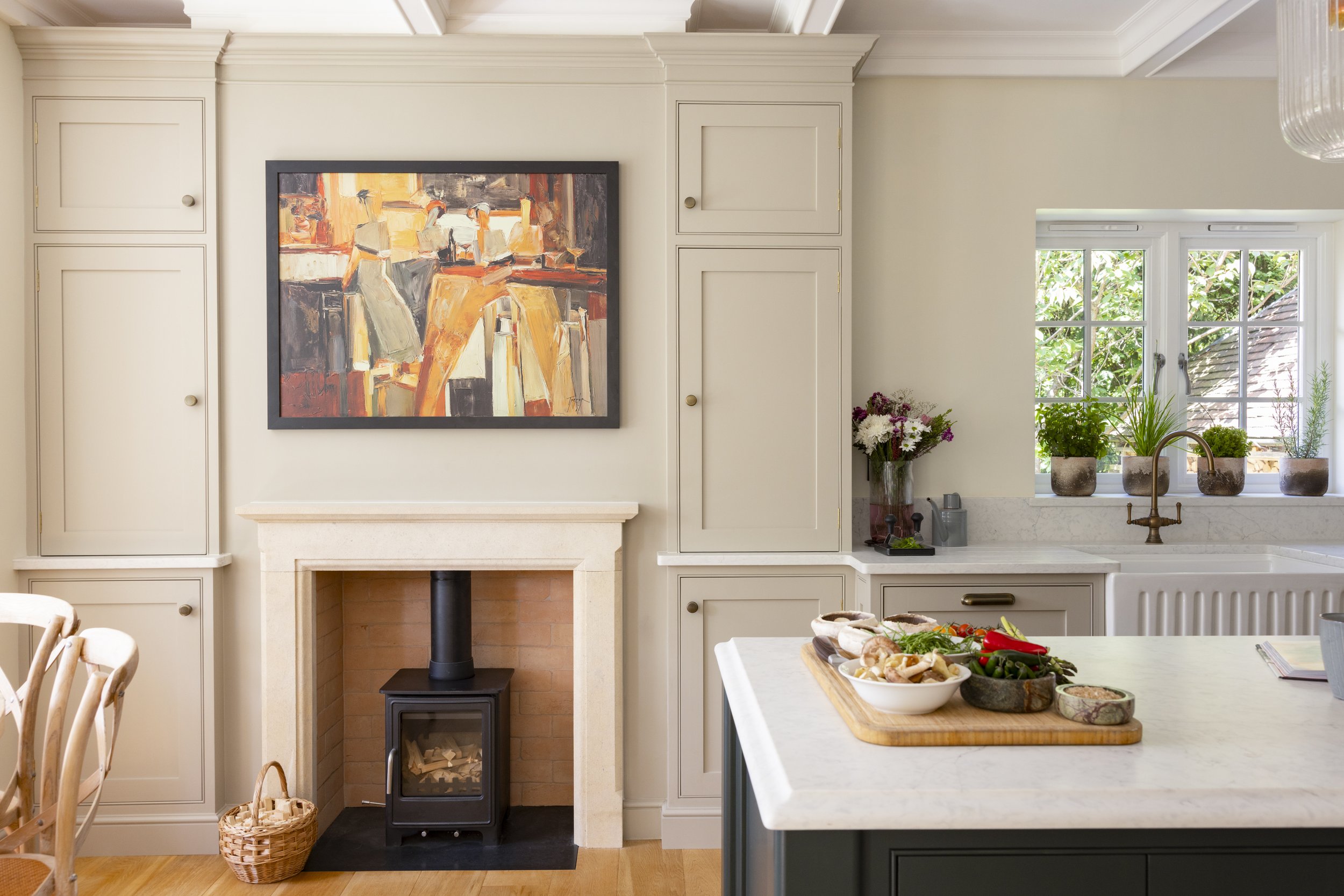 To enhance both the look and feel of your kitchen, we thoughtfully consider worktop materials and their relationship to your space. Lighter surfaces, such as Caesarstone ‘Snow’ or pale fossilised limestone, can help maximise natural light—an ideal choice for kitchens that need to feel brighter and more open. For added depth and subtle drama, we can introduce deeper tones on an island or feature area, striking a balance between airiness and character. Our approach ensures that every surface not only stands up to daily use but also complements your chosen colour palette and overall design, creating a harmonious and practical workspace.